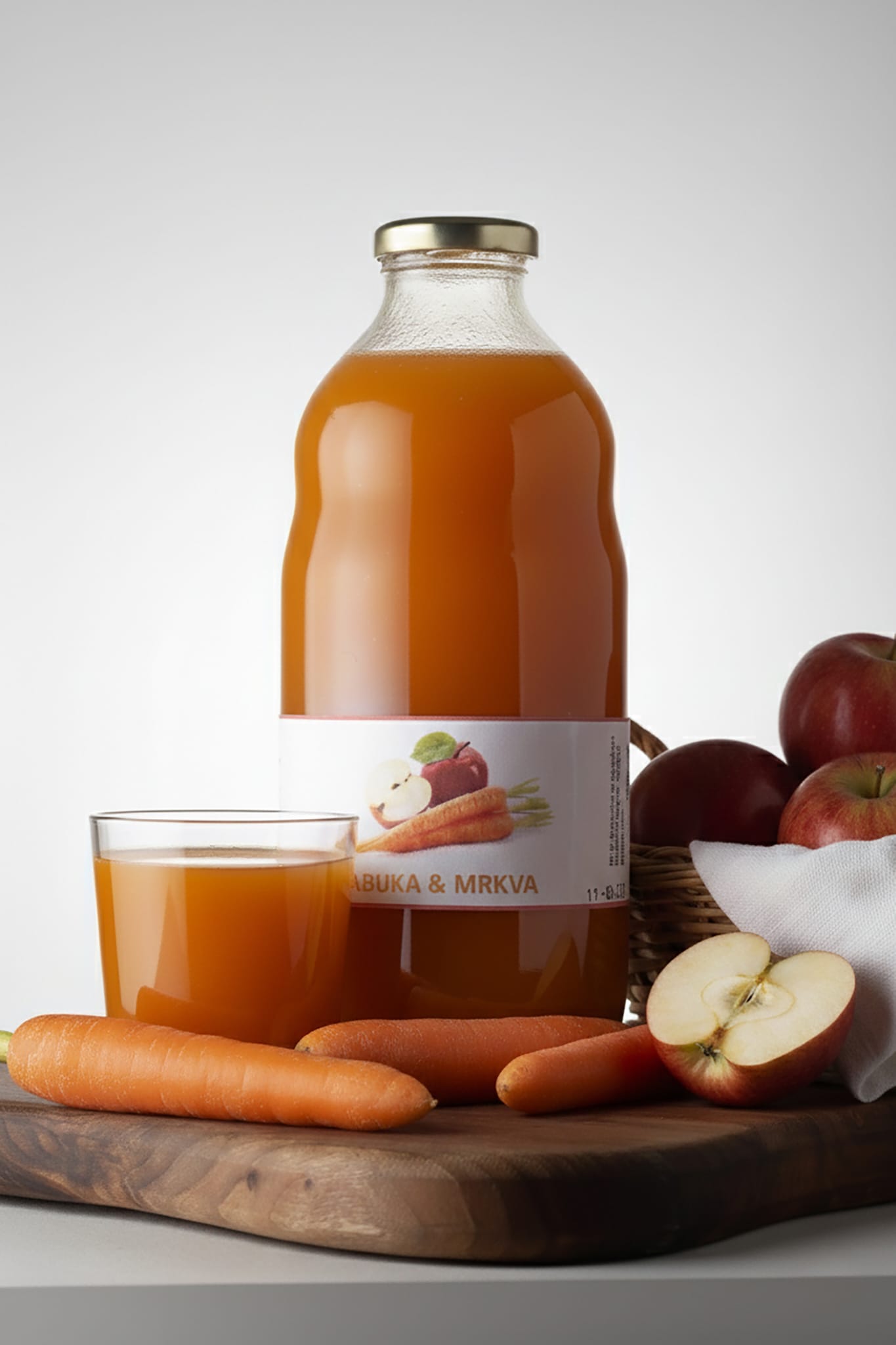 Gusti sok od jabuke i mrkve vrlo je ukusan napitak. Pripremljen je od svježih plodova jabuke i mrkve, potpuno prirodan bez dodanih aditiva, boja i konzervansa.
